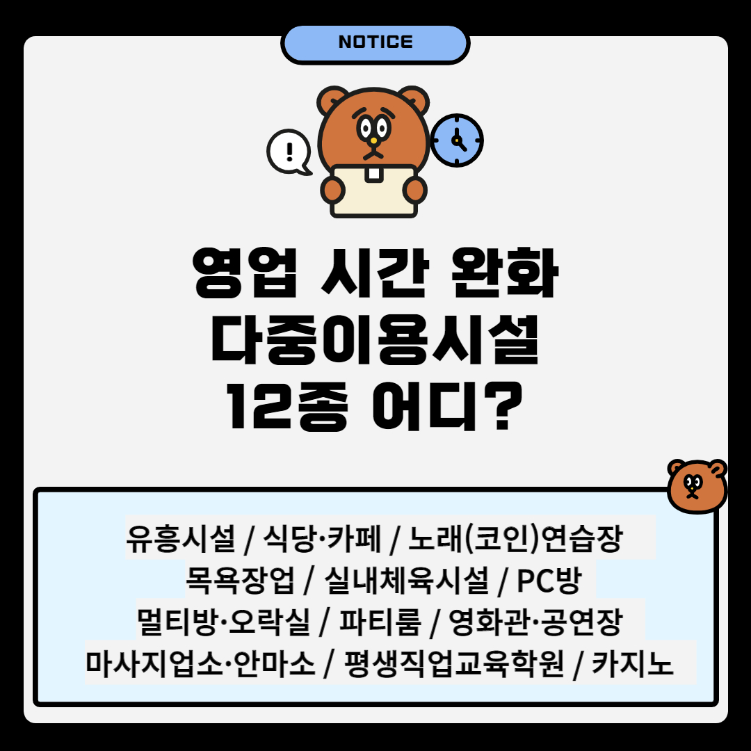 이에 따라 유흥시설과 식당·카페, 노래(코인)연습장, 목욕장업, 실내체육시설, PC방, 멀티방·오락실, 파티룸, 카지노, 마사지업소·안마소, 평생직업교육학원, 영화관·공연장은 내일부터 밤 11시까지 영업할 수 있습니다.