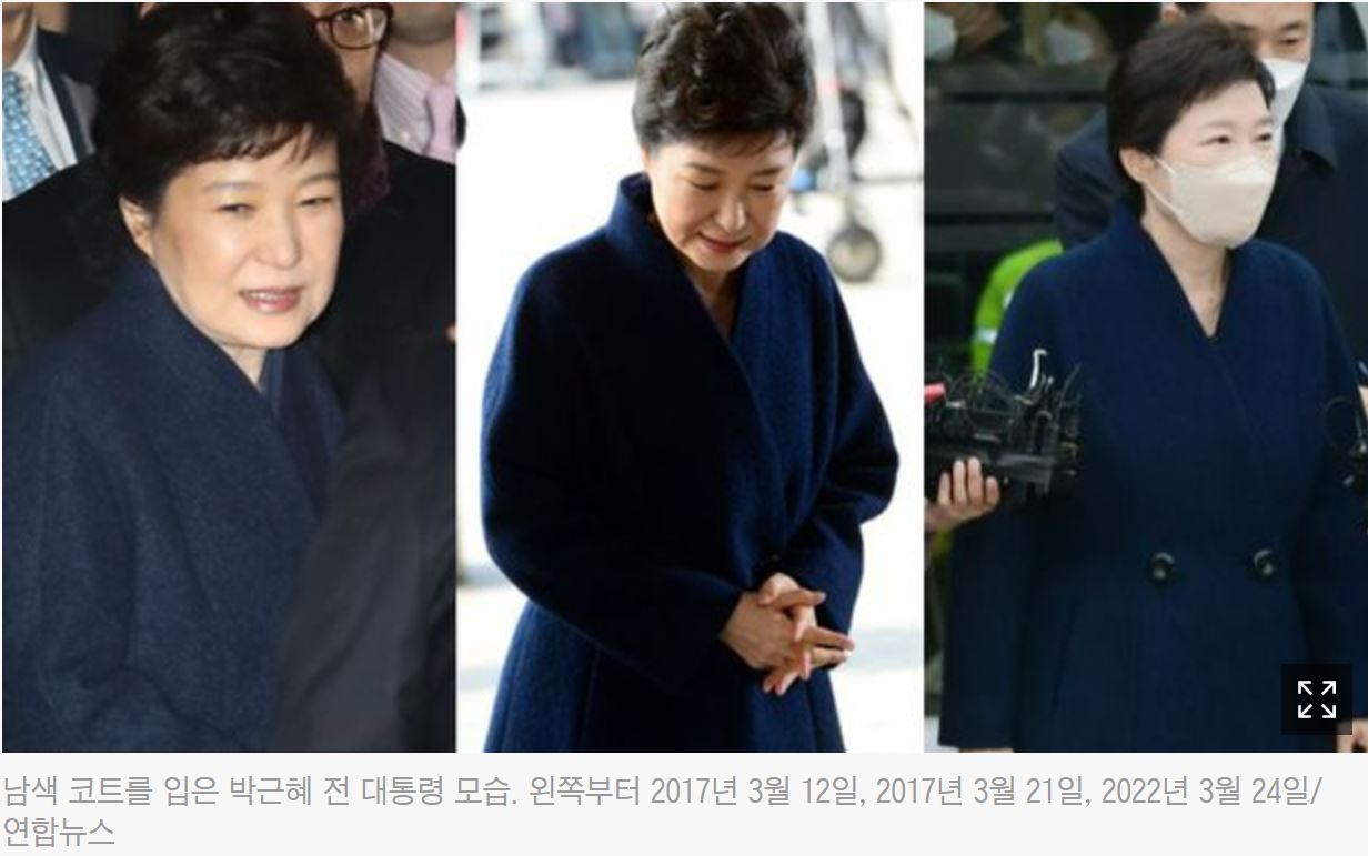 네티즌들은 “눈에 익은 코트”라는 반응을 보였습니다. 네티즌 말대로, 박근혜 전 대통령은 2015년부터 이 남색 코트를 입어 왔습니다. 허리가 살짝 들어간 남색 숄 칼라 코트는 박근혜 전 대통령의 올림머리처럼 트레이드마크가 되었습니다.