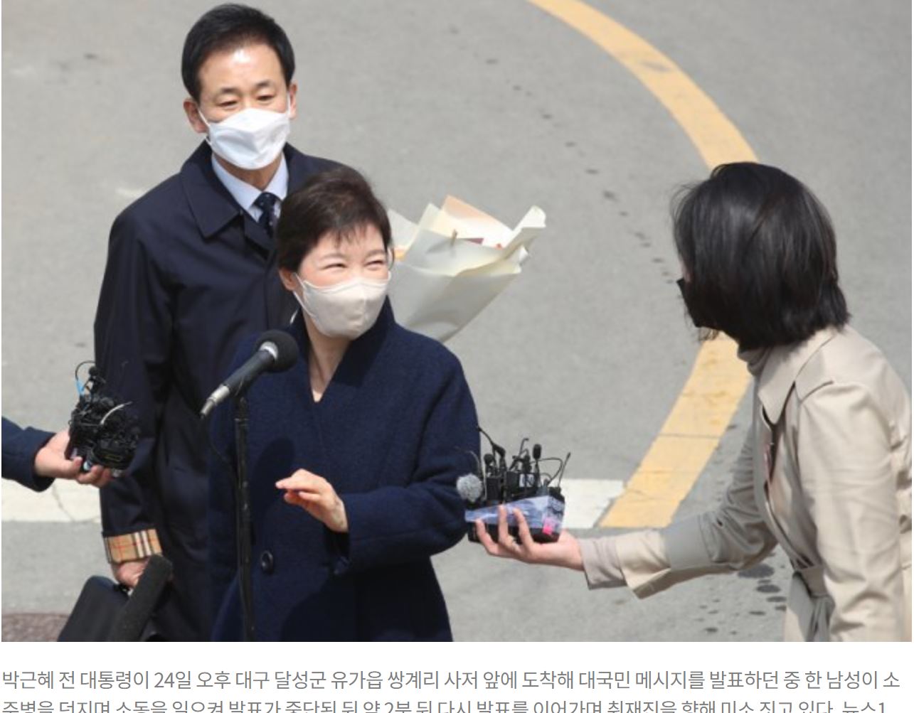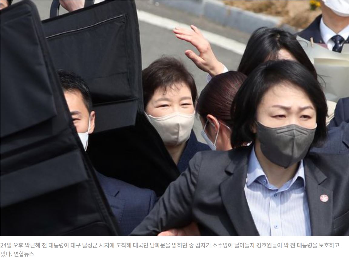 03월 24일 퇴원한 박근혜 전 대통령이 대구 달성 사저 앞에서 인사말을 하는 중에 누군가 소주병을 투척하는 소동이 벌어졌습니다.