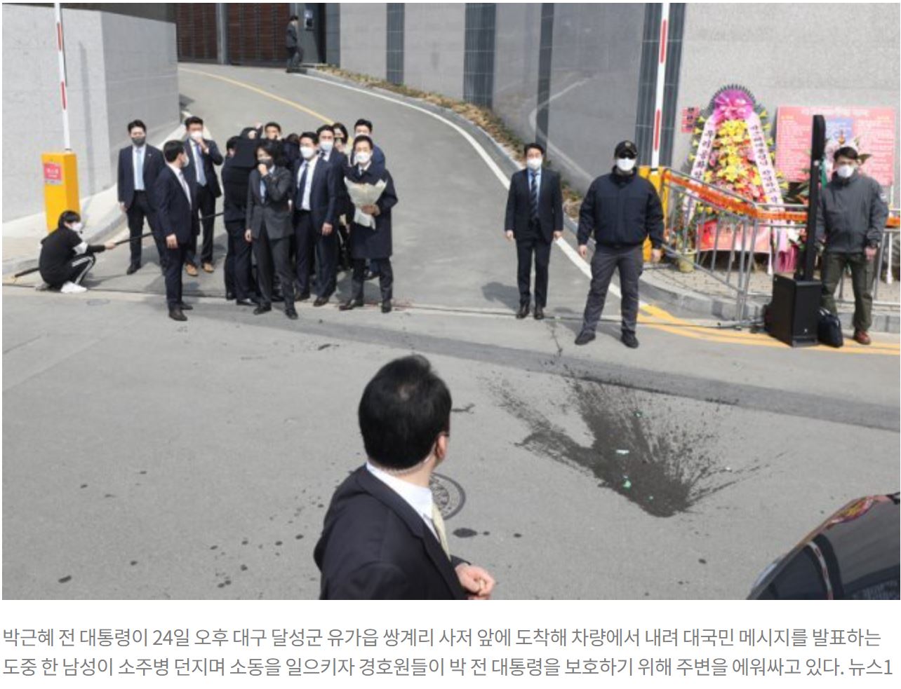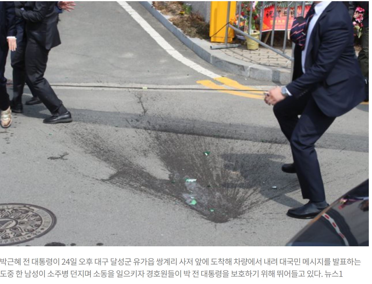 박근혜 전 대통령은 이날 낮 12시15분경 대구 달성군 유가읍 사저에 도착해 시민들 앞에서 입을 열었습니다. 박근혜 전 대통령이 발언을 시작한 지 1분 정도 지났을 무렵, 인파 속에서 박근혜 전 대통령이 서있는 쪽을 향해 갑자기 소주병이 날아들었습니다.