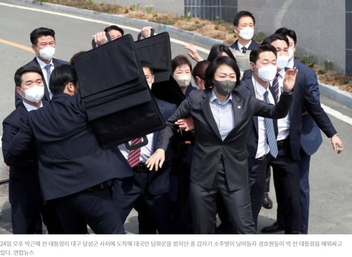 03월 24일 퇴원한 박근혜 전 대통령이 대구 달성 사저 앞에서 인사말을 하는 중에 누군가 소주병을 투척하는 소동이 벌어졌습니다.