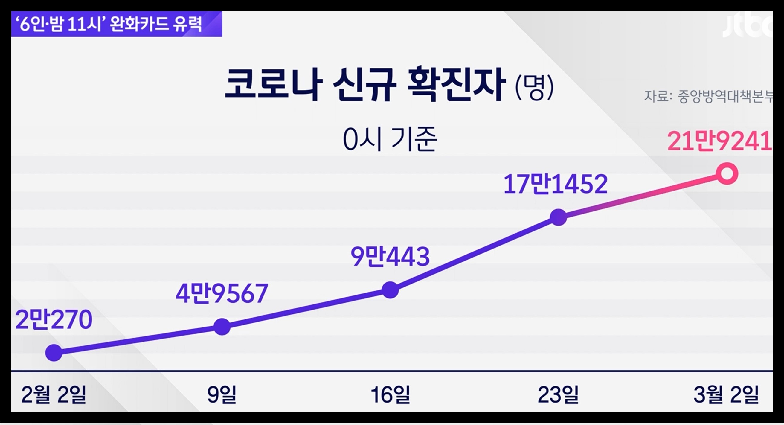 이날 오후 9시 기준 확진자는 22만명을 넘어서면서 사상 최대치였던 지난 1일(21만 명) 기록을 뛰어넘었습니다. 전날 “확진자가 정점에 가까워진다고 판단한다”던 손영래 중앙사고수습본부(중수본) 사회전략반장 발언과 배치되는 결과였습니다.
