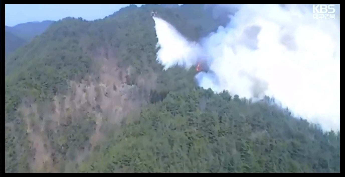 산림 당국은 헬기를 이용해 송전선로 주변으로 불길이 번지지 않도록 물을 뿌리고 있습니다. 현재 불길이 번지는 방향을 따라가 보면 부구해변 주변으로 북면사무소와 중학교 등이 있습니다. 이 지역에 불길이 번지는 걸 막기 위해 방선을 구축한 상태입니다.