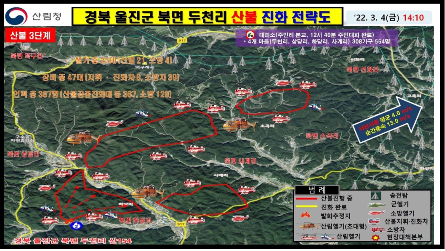 남태현 중앙산불방지대책본부 차장은 "현재 울진 일대에 건조경보가 발효 중이고 순간 초속 25m 이상 강풍이 불어 대형산불주의보가 발령됐다"며 "산불은 서남서쪽에서 부는 강한 바람을 타고 확산하고 있어 울진주민들은 산림당국 및 울진군에서 발표하는 재난 방송에 관심을 기울여 달라"고 말했습니다.