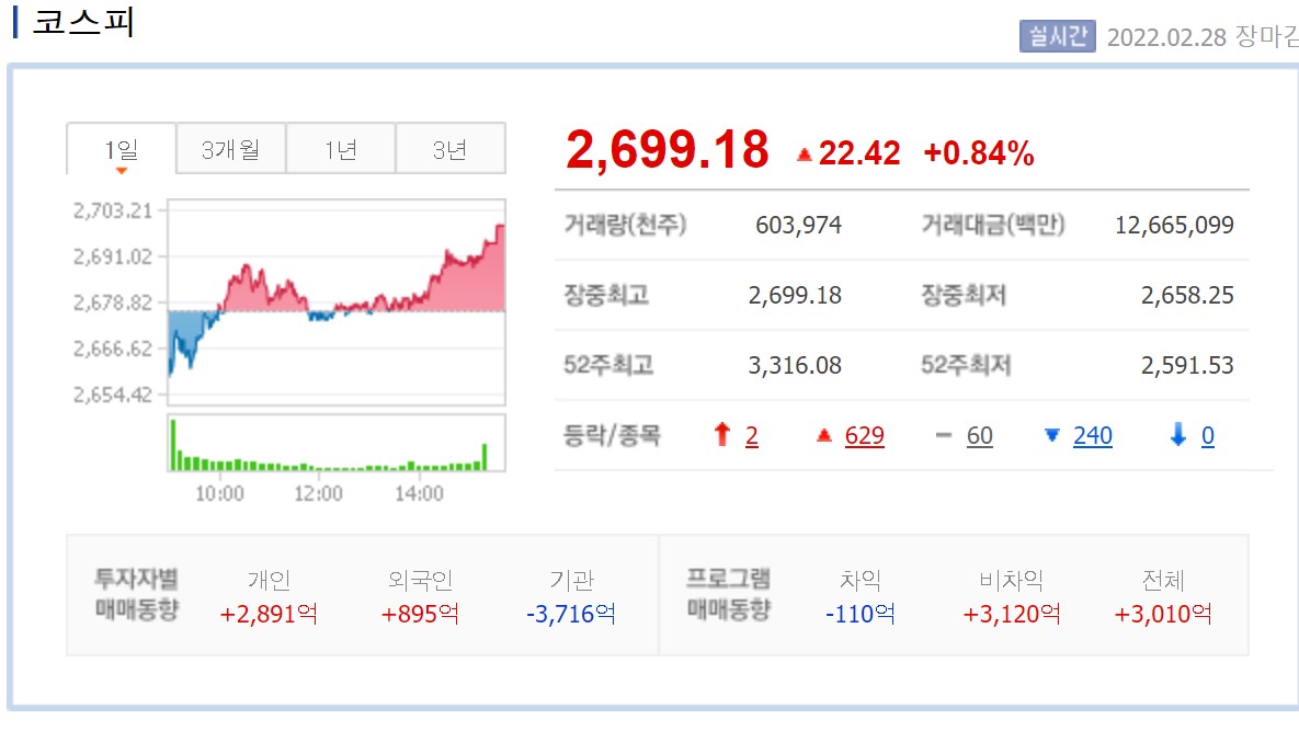 코스피가 우크라이나와 러시아 간의 협상 기대감으로 28일 상승 마감했습니다. 이날 코스피는 전 거래일보다 22.42포인트(0.84%) 오른 2,699.18에 장을 마쳤습니다. 지수는 전장보다 13.76포인트(0.51%) 내린 2,663.00에 출발한 뒤 하락하다 오전 중 상승 전환했습니다. 이후 등락을 반복하며 혼조세를 보이다 장 마감을 앞두고 오름세를 지속했습니다.