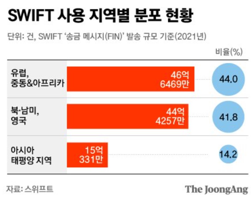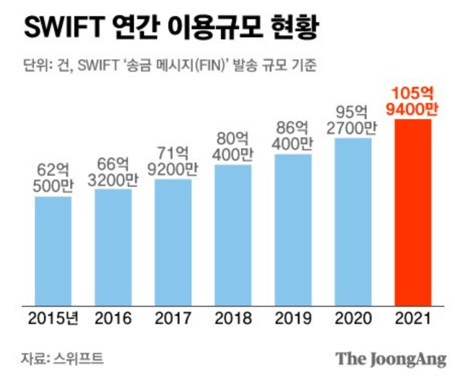 (▣ SWIFT란? 1973년 금융회사 간 금융 거래와 결제 업무를 위해 만든 글로벌 메시지 시스템입니다. '누가 누구에게 어디 은행으로 돈을 보내겠다'는 것을 코드(SWIFT 코드)화한 것입니다. 일종의 '지급 지시서'입니다. 전 세계 200여 개국 금융기관 1만 1644개가 SWIFT로 돈을 지불하거나 무역대금을 결제하고 있습니다. 지난해 SWIFT 시스템을 통한 하루 평균 거래만 4200만 건에 이릅니다.