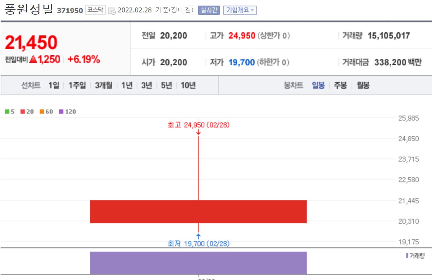 풍원 정밀이 코스닥시장 상장 첫날인 28일 공모가를 41%가량 웃도는 가격에 마감했습니다. 이날 코스닥시장에서 풍원 정밀은 시초가(2만 200원) 대비 6.19% 오른 2만 1천450원에 거래를 마쳤습니다. 이는 공모가 1만 5천200원보다는 41.18% 높은 수준입니다.