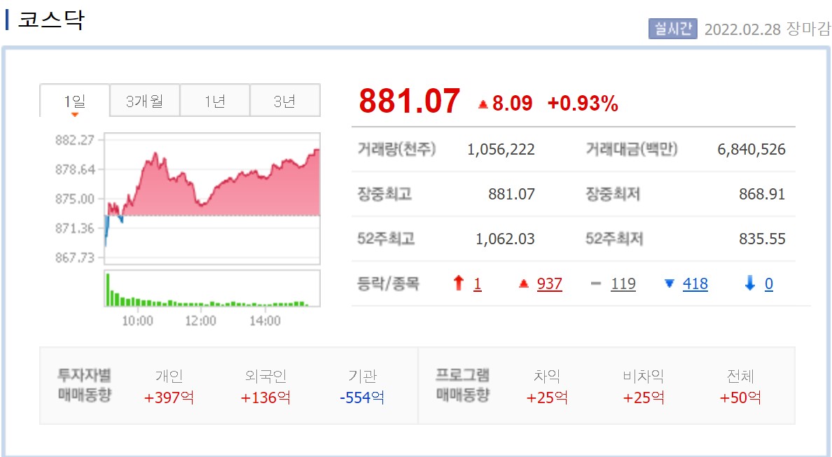 코스닥지수는 전장보다 8.09포인트(0.93%) 오른 881.07로 마감했습니다. 지수는 전 거래일 대비 2.71포인트(0.31%) 내린 870.27로 출발했습니다. 러시아가 우크라이나와 협상을 위해 벨라루스 민스크로 대표단을 보낼 준비가 돼 있다고 크렘린궁이 밝히면서 대화 가능성에 대한 기대로 투자 심리가 개선되었습니다.
