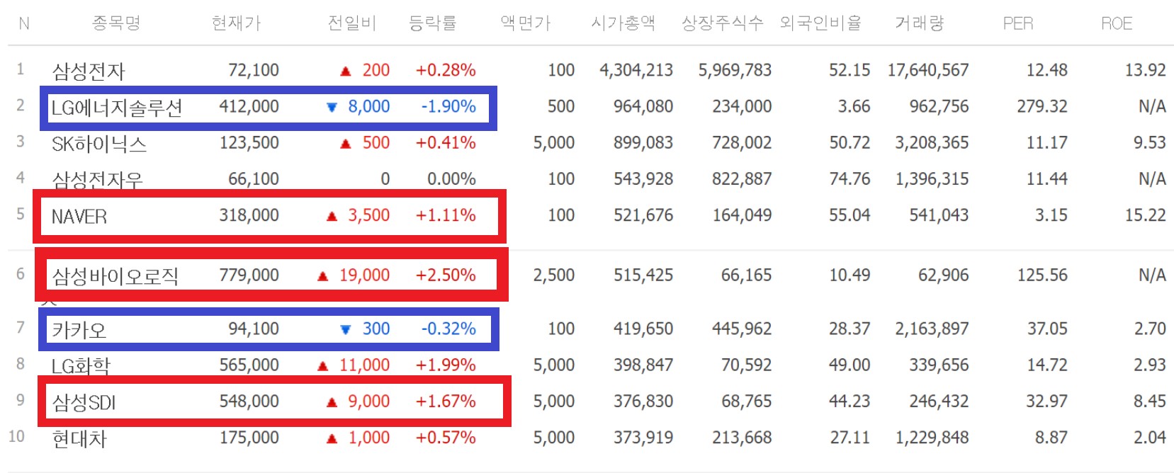 시가총액 상위주 가운데 삼성바이오로직스가 2% 넘게 올랐다. 네이버, LG화학, 삼성 SDI 등은 1% 넘는 상승세를 보였습니다. 반면 LG에너지솔루션은 2% 가까이 주가가 빠졌고, 카카오도 소폭 하락한 채 거래를 마쳤습니다.