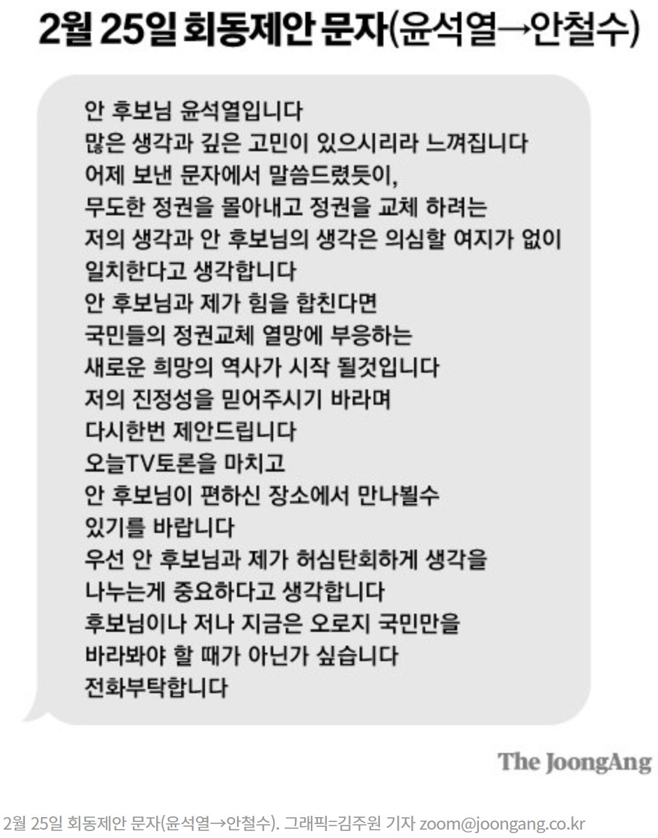 "특히 어제는 양측의 전권 대리인들이 오후 2시부터 4시까지 회동을 했고 최종 합의를 이뤄서 저와 안 후보에게 보고가 됐다"며 "저와 안 후보와의 회동일정 조율만 남은 상태였다"는 게 윤 후보의 주장입니다.