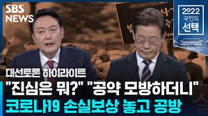 윤석열 후보 = “작년 민주당에서 손실보상 없는 손실보상법을 날치기 한 직후부터 50조원의 재원을 마련해서 정부의 방역 정책으로 인해서 손실을 본 자영업자와 소상공인에 대해서 실질적인 피해 보상을 해야 된다고 지금까지 일관되게 주장을 했다. 이 후보나 민주당에서는 작년에 내내 실질적인 손실에 대한 피해 보상 얘기는 안 하고 전 국민 재난지원금만 말하다가 금년 들어 선거 앞두고 갑자기 50조원을 만든다고 내 공약을 모방했다. 결국은 그것도 추경으로 올리지 못하고 14조원으로 예결위에서 날치기를 했다. 우리는 할 수 없이 사각지대 놓인 분들에 대한 3조원을 보태서 일단 17조원으로 본회의에서 합의 통과를 시킨 거다.”