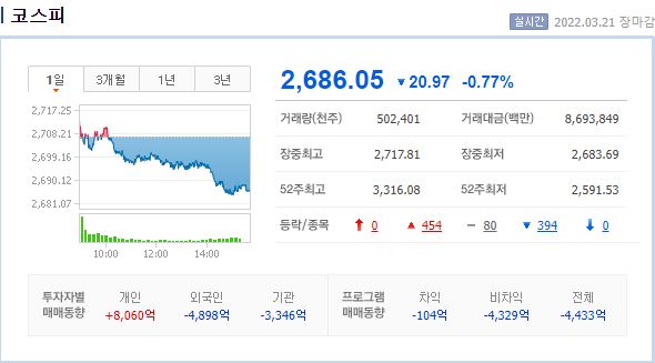 21일 코스피는 전 거래일 대비 20.97포인트(0.77%) 내린 2686.05에 거래를 마쳤습니다. 이날 10.79포인트 상승 출발한 지수는 개장 후 한 시간 가량 보합권을 오가다 하락폭을 키웠습니다.