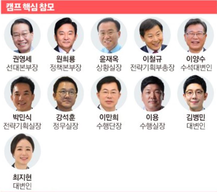 정책 분야에선 원희룡 정책본부장이 활약했습니다. 경선 당시엔 경쟁자였지만, 대선 승리를 위해선 참모가 되기를 자처했습니다. 대장동 의혹 등을 파헤치는 네거티브 전선 전면에도 나섰습니다. 박근혜 정부의 브레인으로 꼽혔던 강석훈 정무실장, 김현숙 정책메시지 팀장 등은 캠프 상황실 산하에 배치돼 정책본부와 유기적 협조를 이어왔습니다.