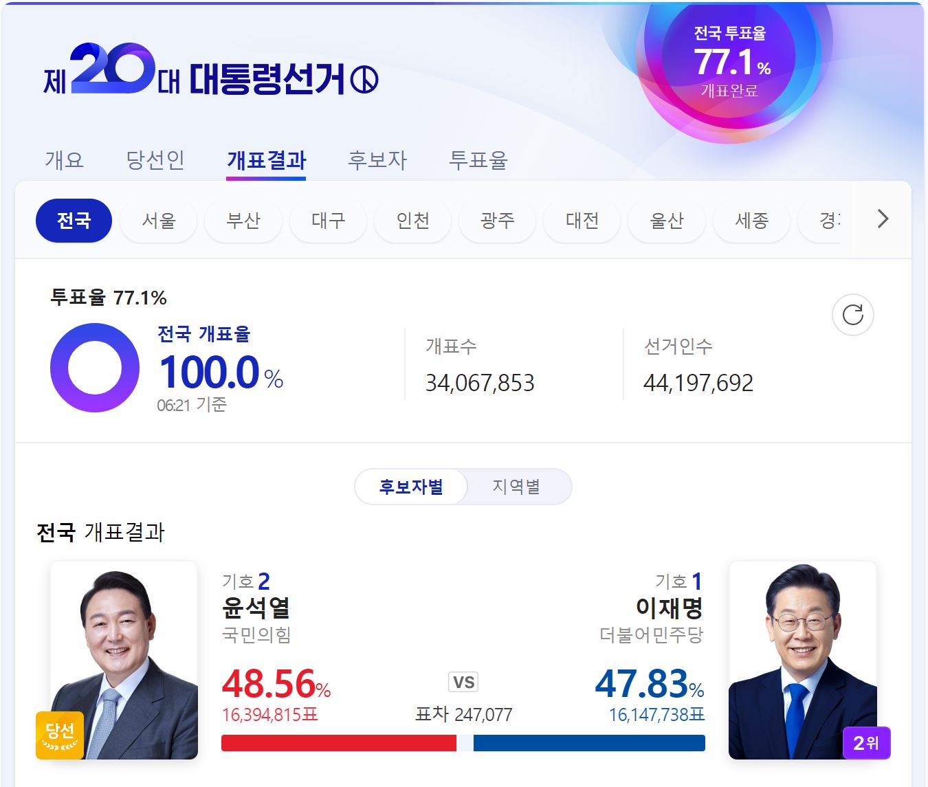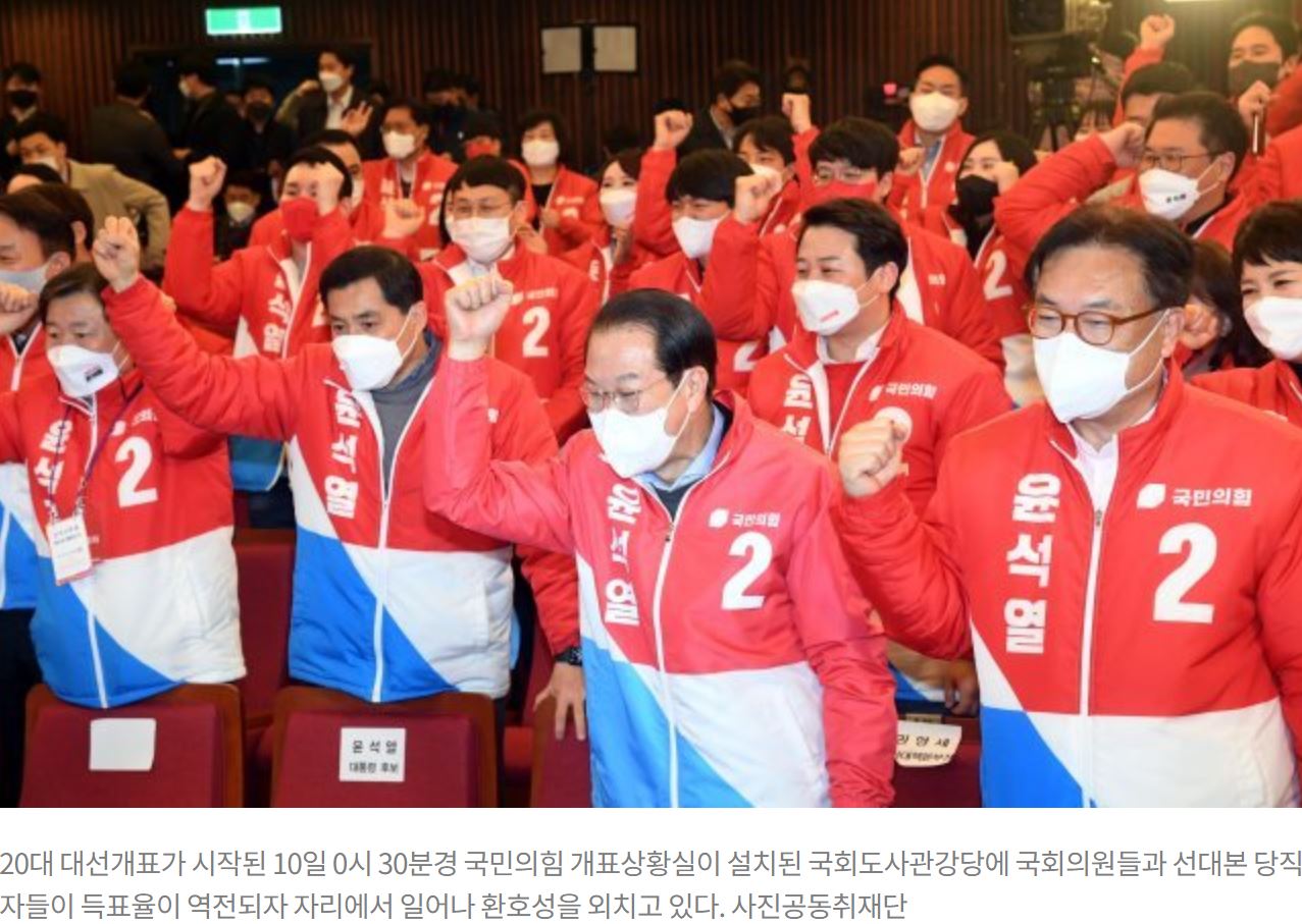 이날 선거는 ‘역대 최악 비호감 대선’이라는 평가 속에서 새벽까지 피 말리는 초박빙 레이스를 펼쳤습니다. 개표 초반 사전 투표를 먼저 개봉하면서 더불어민주당 이 후보가 한때 10%포인트 넘게 앞서 갔지만 10일 0시 32분을 넘어서면서 국민의힘 윤 후보가 역전하며 격차를 조금씩 벌려나갔습니다. 정권 교체에 호응하면서도 국정 독주를 할 수 없도록 국민들이 견제했다는 평가가 나왔습니다.