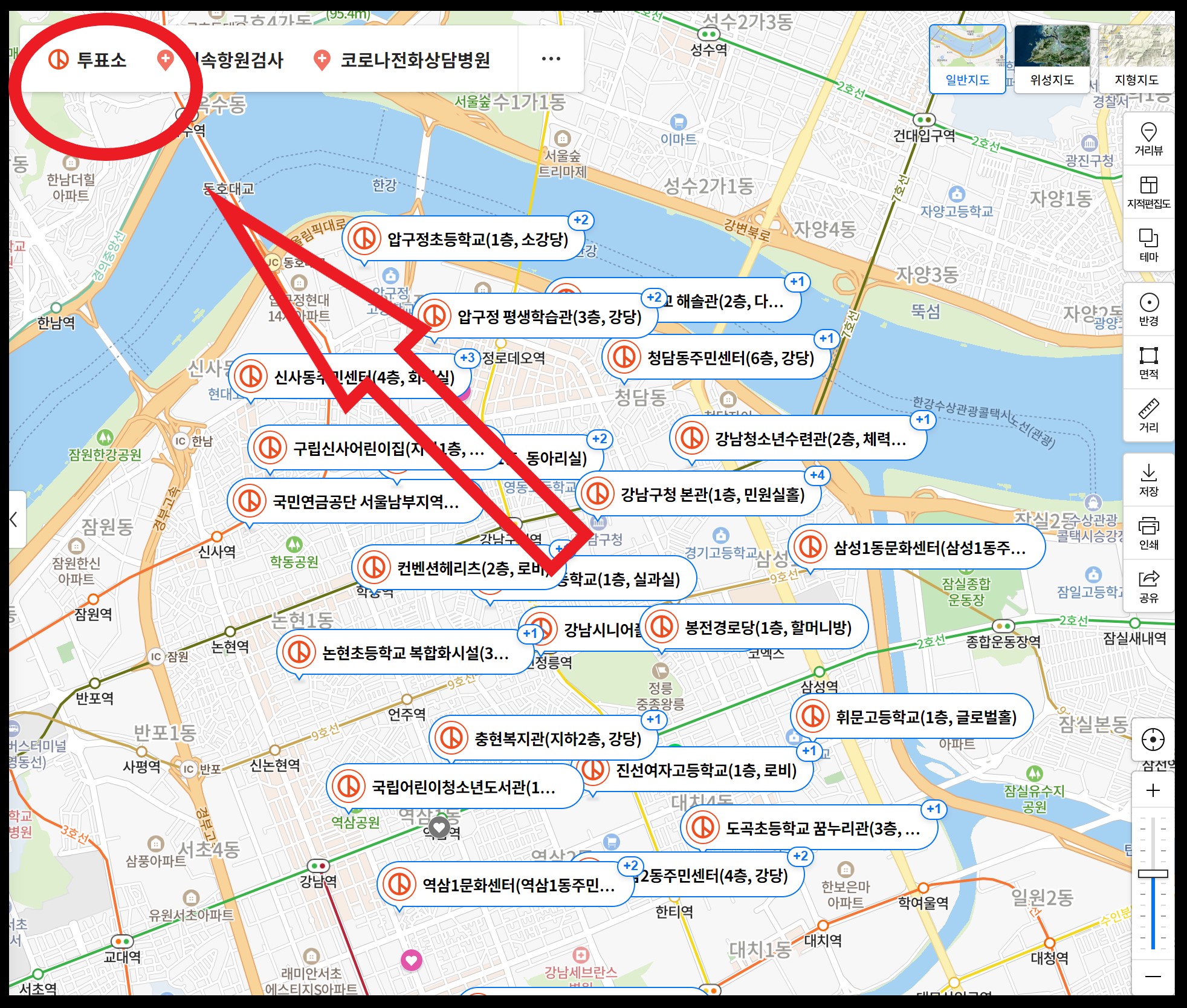 또는 네이버 지도나 카카오 맵을 이용 하여 제20대 대통령 선거 투표소를 찾을 수 있습니다. 바로 아래와 같이 빨간색 화살표를 누르시면 됩니다. 네이버 지도에서 내 주변 투표소를 검색하여 이용하시는 법이 제일 편하고 쉬운 방법일 것 같습니다.