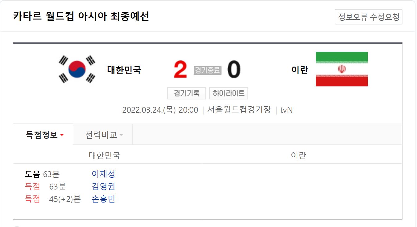 대한민국 축구 대표팀은 03월 24일 오후 8시 서울월드컵경기장에서 열린 이란과 '2022 카타르 월드컵 아시아 최종예선' A조 9차전 홈경기에서 전반 추가시간 터진 손흥민의 선제골과 김영권의 쐐기골을 앞세워 2-0으로 완승을 거뒀습니다.